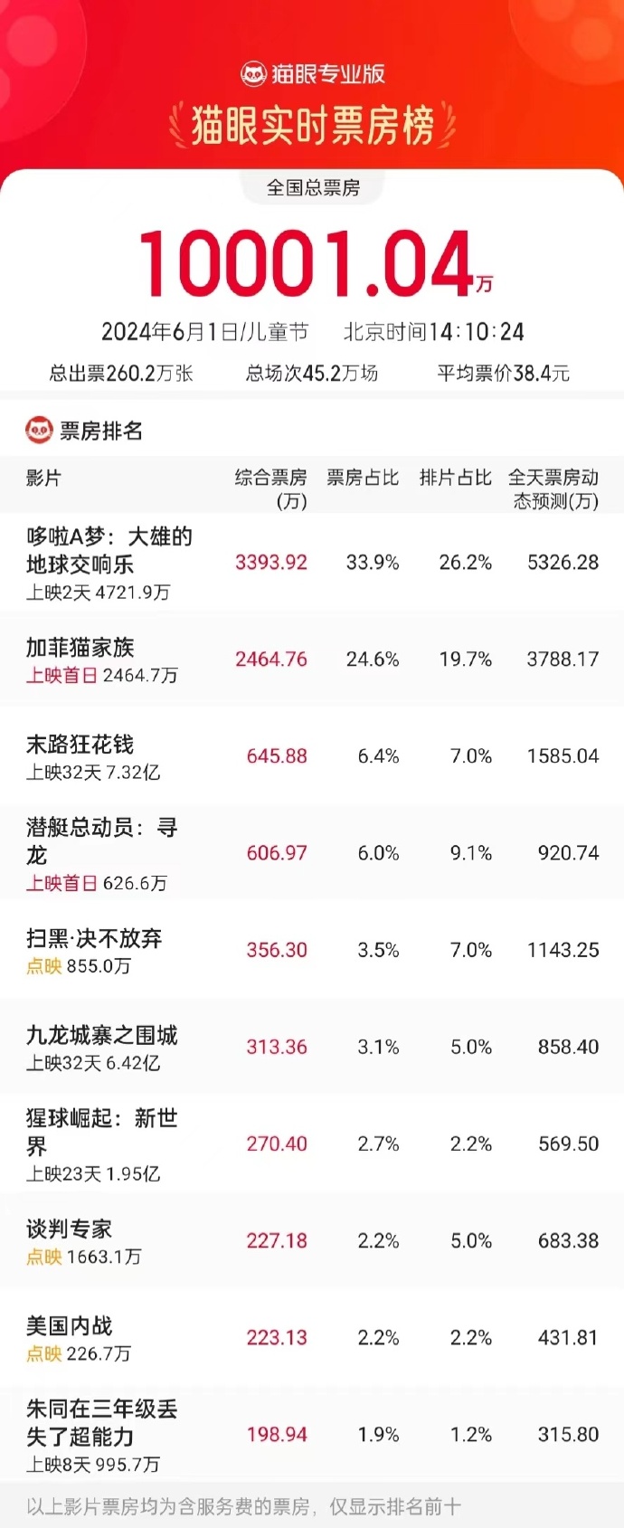 据猫眼专科版数据,6月1日14时10分,2024六一儿童节单日票房破1亿元,《哆啦A梦:大雄的地球交响乐》《加菲猫眷属》《绝路狂费钱》分列票房榜前三位。