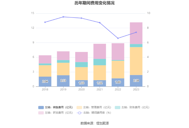 2023年,公司本事用度为13.15亿元,较上年同时增多4.28亿元;本事用度率为7.41%,较上年同时高潮0.81个百分点。其中,销售用度同比增长40.83%,处理用度同比增长58.17%,研发用度同比增长29.47%,财务用度同比增长311.4%。