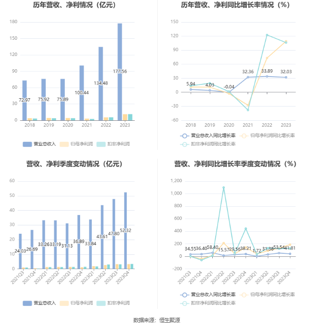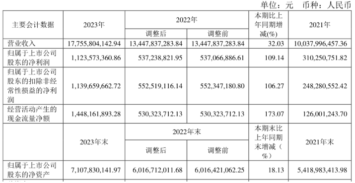 中证智能财讯博威合金(601137)4月23日清晰2023年年报。2023年,公司杀青贸易总收入177.56亿元,同比增长32.03%;归母净利润11.24亿元,同比增长109.14%;扣非净利润11.40亿元,同比增长106.27%;策画行径产生的现款流量净额为14.48亿元,同比增长173.07%;论说期内,博威合金基本每股收益为1.43元,加权平均净金钱收益率为17.31%。公司2023年年度利润分拨预案为:拟向整体激动每10股派4.5元(含税)。
