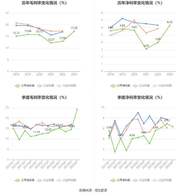 2023年,公司毛利率为17.25%,同比高潮4.31个百分点;净利率为6.33%,较上年同时高潮2.34个百分点。从单季度标的来看,2023年第四季度公司毛利率为24.18%,同比高潮9.76个百分点,环比高潮9.64个百分点;净利率为6.36%,较上年同时高潮3.22个百分点,较上一季度下落0.57个百分点。