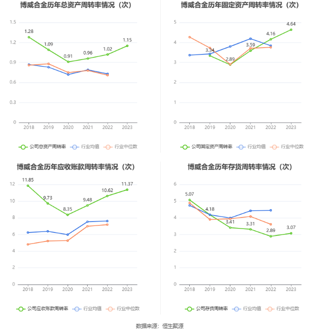 营运才略方面,2023年,公司公司总金钱盘活率为1.15次,上年同时为1.02次(2022年行业平均值为0.73次,公司位居同业业4/16);固定金钱盘活率为4.64次,上年同时为4.16次(2022年行业平均值为3.84次,公司位居同业业7/16);公司应收账款盘活率、存货盘活率辞别为11.37次、3.07次。