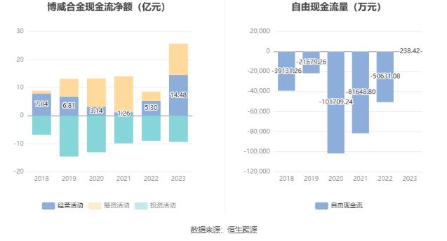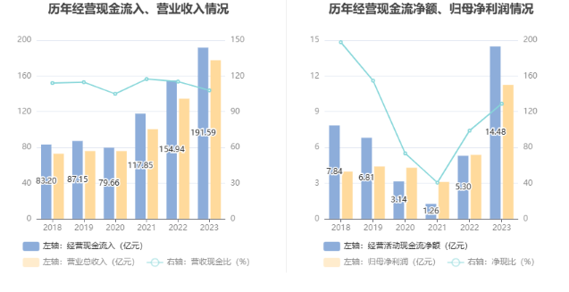 2023年,公司策画行径现款流净额为14.48亿元,同比增长173.07%;筹资行径现款流净额11.14亿元,同比增多7.92亿元;投资行径现款流净额-9.37亿元,上年同时为-8.94亿元。