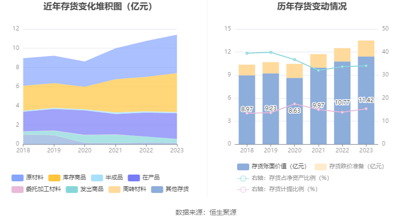 从存货变动来看,放弃2023年年末,公司存货账面价值为11.42亿元,占净钞票的34.04%,较上年末增多6557.27万元。其中,存货跌价准备为2.08亿元,计提比例为15.41%。