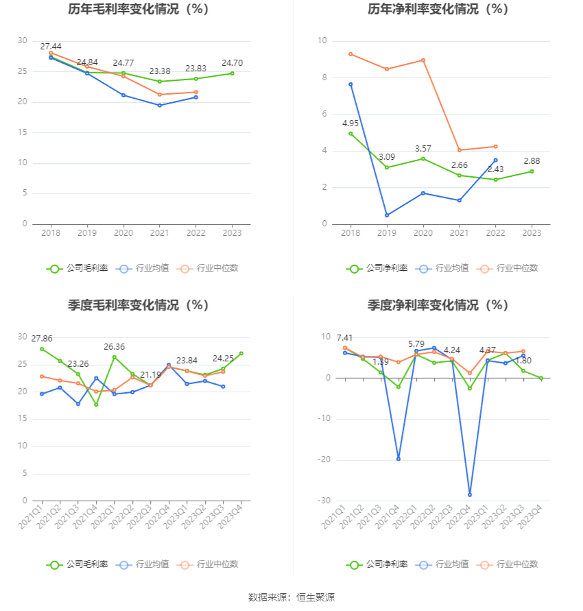 2023年,公司毛利率为24.70%,同比上涨0.87个百分点;净利率为2.88%,较上年同时上涨0.45个百分点。从单季度筹划来看,2023年第四季度公司毛利率为27.05%,同比上涨2.47个百分点,环比上涨2.80个百分点;净利率为0.04%,较上年同时上涨2.55个百分点,较上一季度下落1.76个百分点。