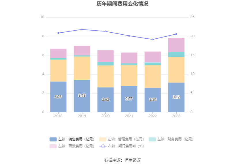 2023年,公司时代用度为7.81亿元,较上年同时增多1.43亿元;时代用度率为20.61%,较上年同时上涨1.44个百分点。其中,销售用度同比增长20.76%,照看用度同比增长14.61%,研发用度同比增长29.36%,财务用度同比增长71.97%。