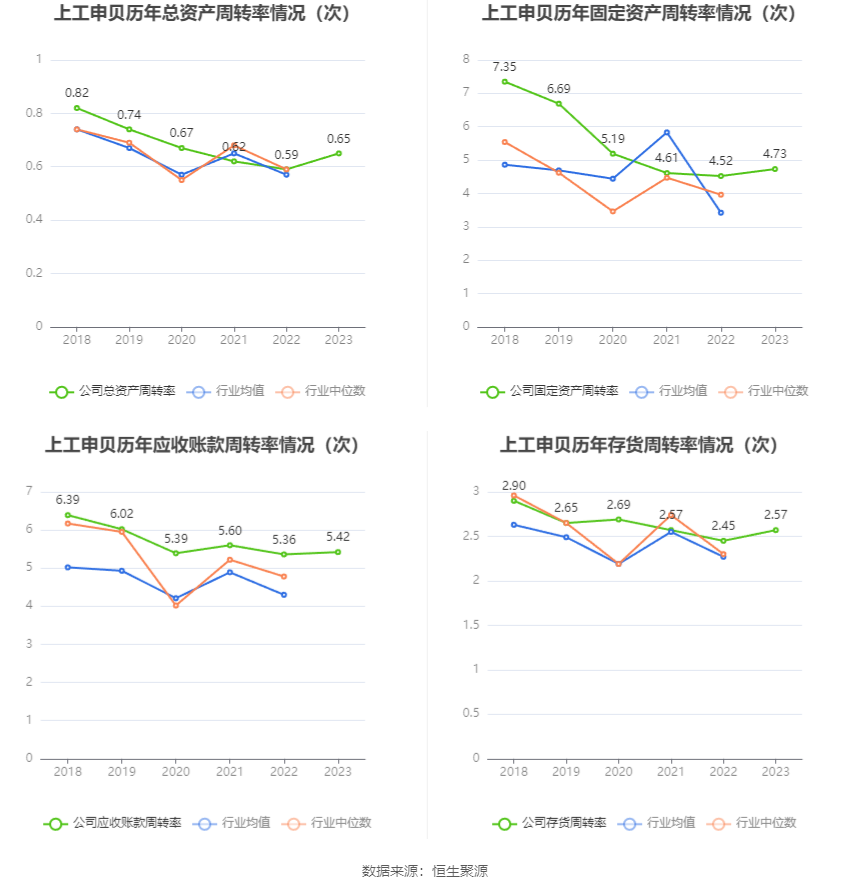 营运才气方面,2023年,公司公司总钞票盘活率为0.65次,上年同时为0.59次(2022年行业平均值为0.57次,公司位居同业业6/11);固定钞票盘活率为4.73次,上年同时为4.52次(2022年行业平均值为3.42次,公司位居同业业3/11);公司应收账款盘活率、存货盘活率分裂为5.42次、2.57次。