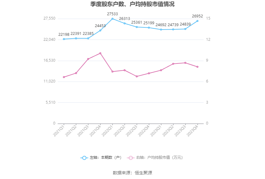 筹码采集度方面,放弃2023年年末,公司A股激动总户数为2.7万户,较三季度末增长了2113户,增幅8.51%;户均抓股市值由三季度末的8.69万元下落至8.12万元,降幅为6.56%。
