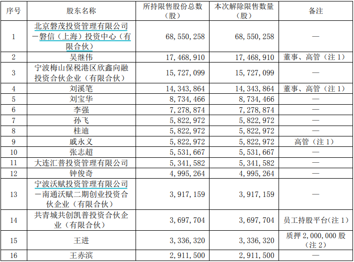 这次解禁股东共六位,包括中国信息通讯科技集团有限公司、电信科学技巧洽商院有限公司、湖北长江中信科出动通讯技巧产业投资基金结伙企业(有限结伙)、大唐电信科技产业控股有限公司等6位,为公司的前六大股东。