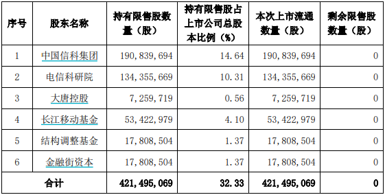 大唐电信本次限售股解禁明细