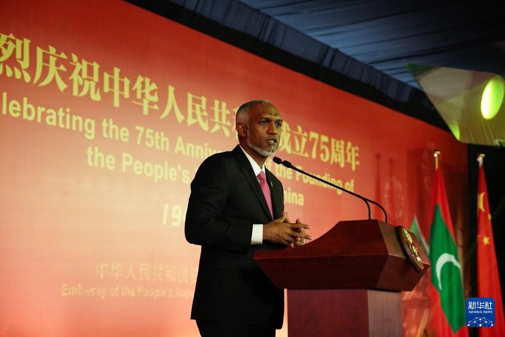9月30日,马尔代夫总统穆伊兹在马累举行的庆祝中华东说念主民共和国缔造75周年理财会上致辞。新华社记者 陈冬书 摄