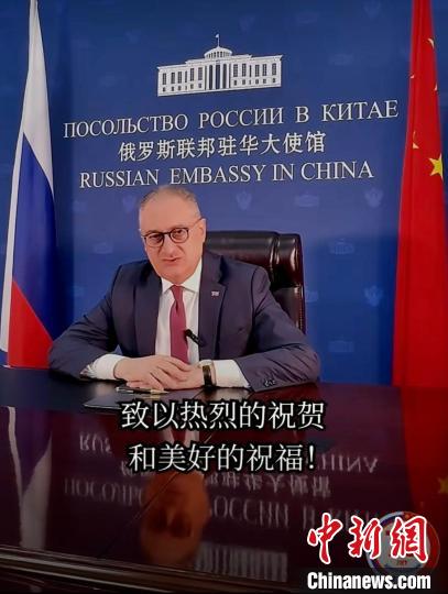 图为俄罗斯驻华大使莫尔古洛夫发表视频贺辞截图。俄罗斯驻华大使馆供图。