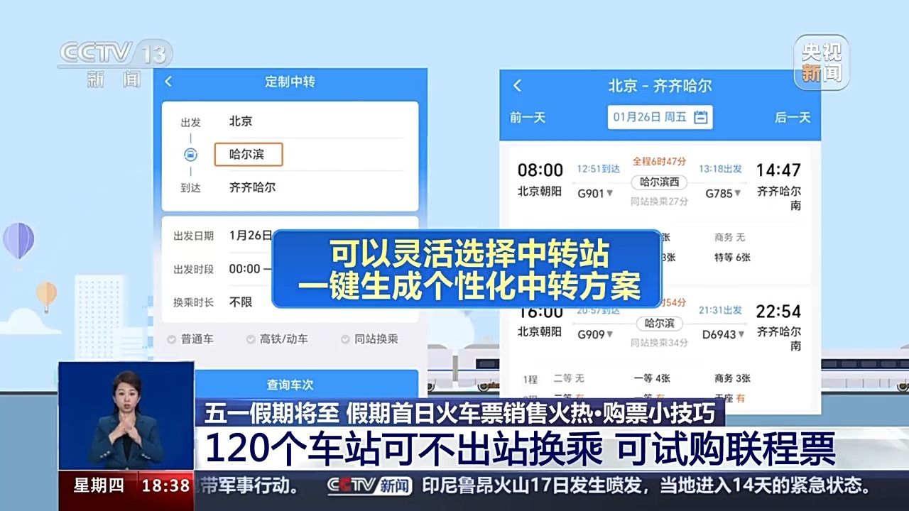 铁路部门漠视,搭客也可尝试铁路12306App的中换取乘功能,通过购买联程车票格式,分段搭车出行。截止当今,铁路部门已在120个主要车站开展了方便换乘作事,搭客无需出站即可进行换乘。